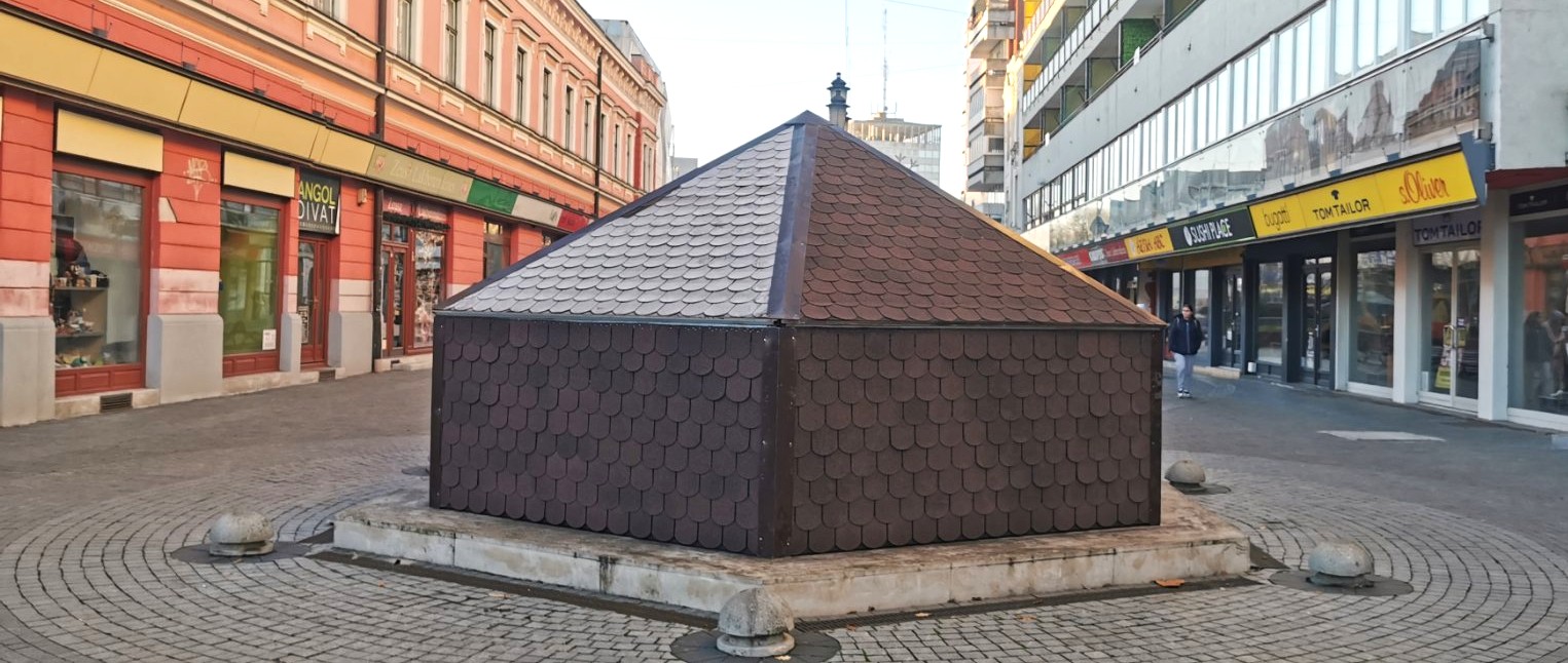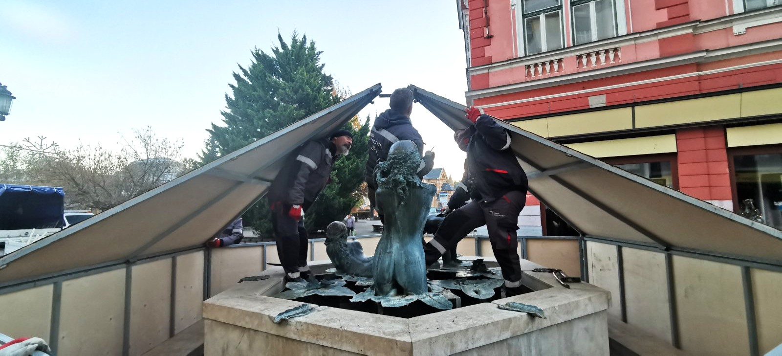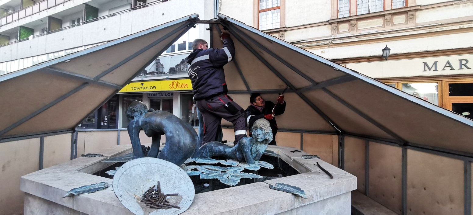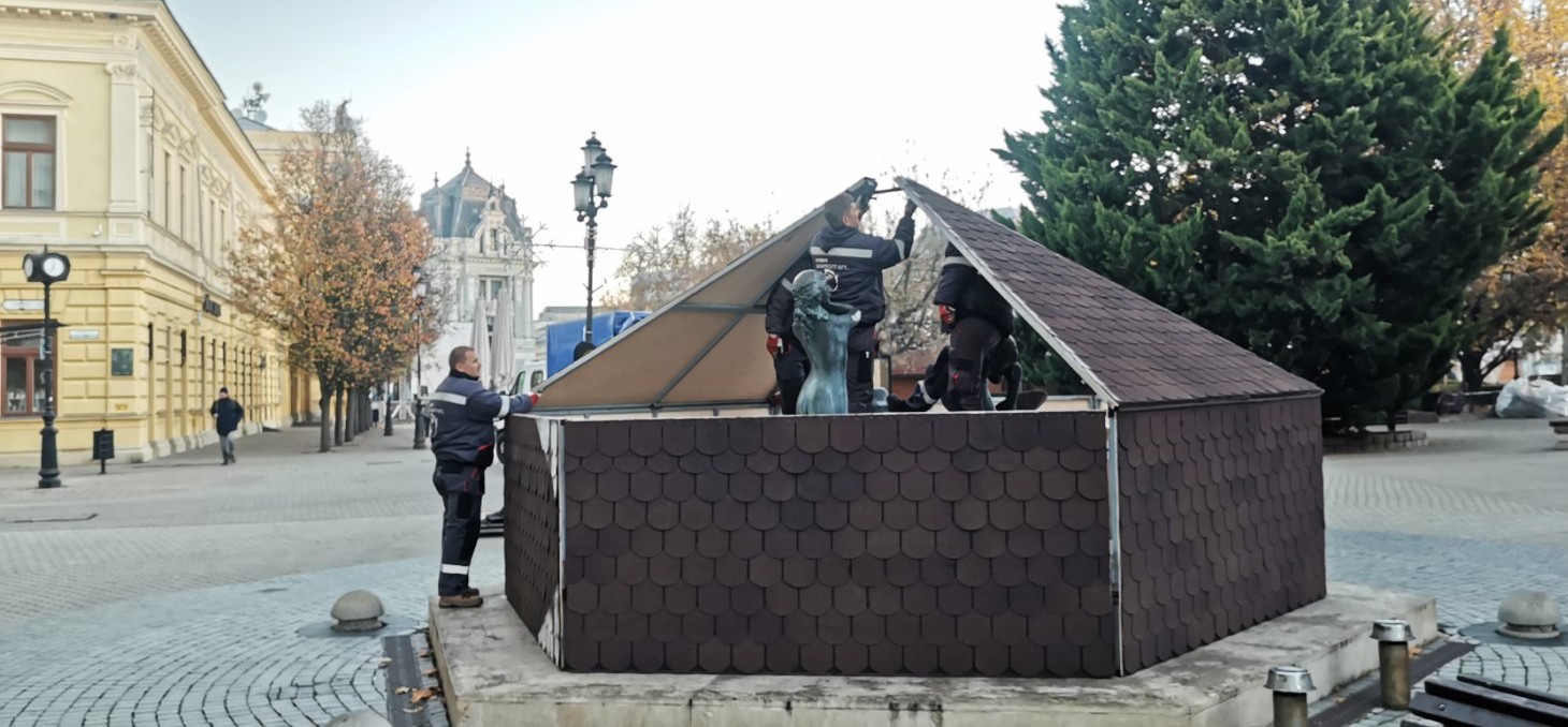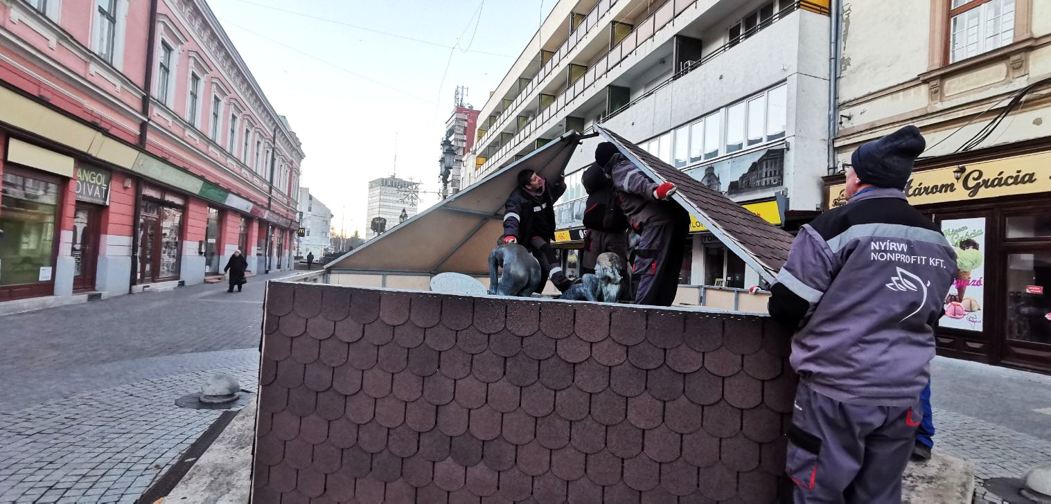 A NYÍRVV Nonprofit Kft. munkatársai a mai napon a fagykárok megelőzése érdekében elvégezték a Három Grácia szökőkút téli lefedését. A védőburkolat teljes felújításon esett át, melynek során vadonatúj zsindely került rá, így immár megújult külsővel óvja a műalkotást a hideg hónapokban.