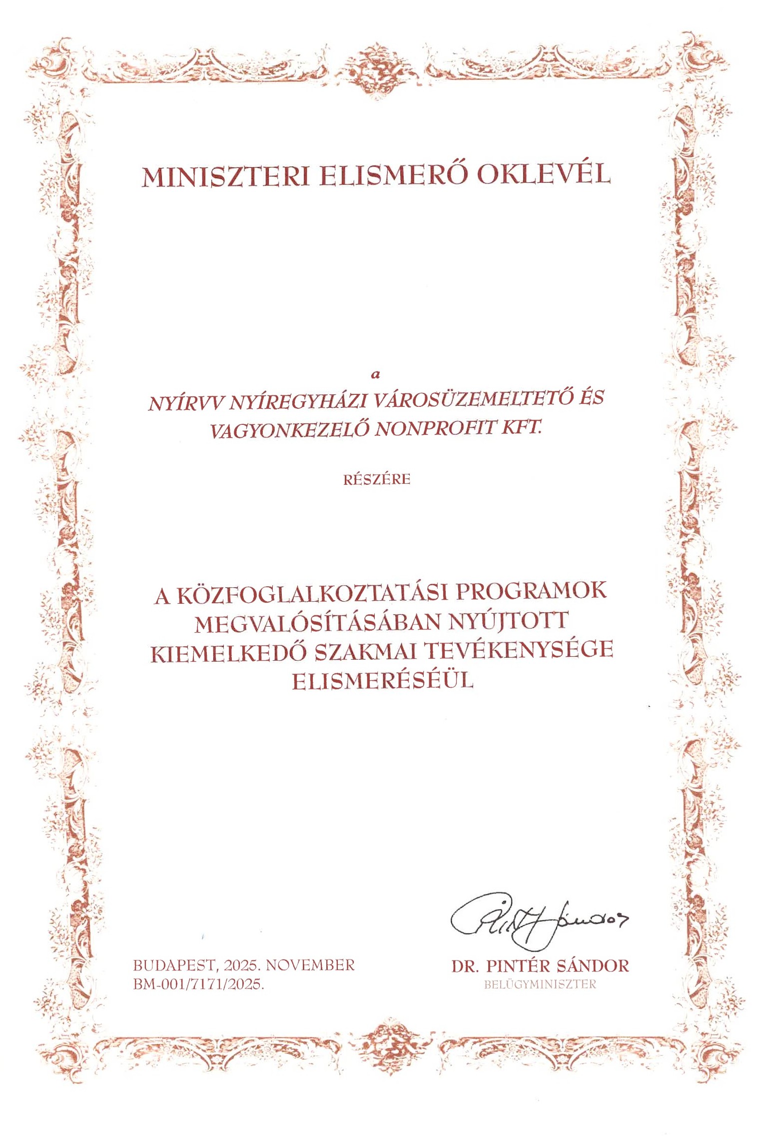 Nagy megtiszteltetés számunkra, hogy a NYÍRVV Nonprofit Kft. Országos Hajléktalan Közfoglalkoztatási programja 2025-ben a díjazottak között szerepel.