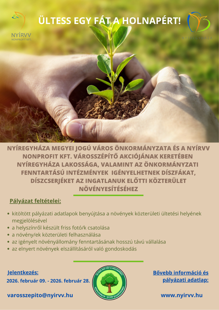 2026. évben ismét lehetősége nyílik városunk lakosságának, hogy közösen tegyünk Nyíregyházáért és még szebbé és zöldebbé tegyük környezetünket az „Ültess egy fát a holnapért!” program keretében.